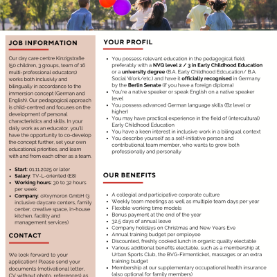 • Company: Kita Kinzigstraße is part of oXxymoron gemeinnützige GmbH, which operates three inclusive daycare centers, a family center, a creative space, and an in-house kitchen, and supports its employees with facility and management services.
